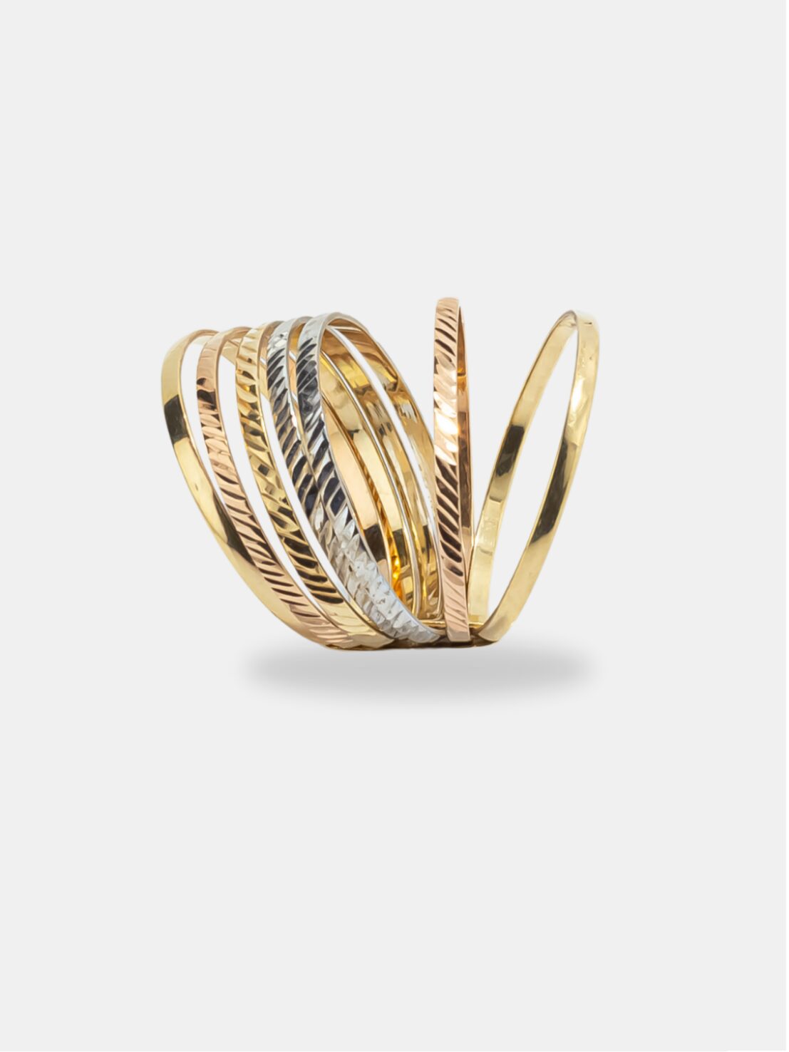 O Anel Ouro 18k 7 em 1 Três Ouros é uma joia de forte impacto visual, desenvolvida para quem busca presença e exclusividade. Seu design é composto por sete aros integrados em uma única peça, criando a sensação de múltiplos anéis unidos de forma harmoniosa. Produzido em ouro amarelo, branco e rosé, recebe acabamento polido e esculpido que valoriza o contraste entre as cores e evidencia os detalhes do trabalho artesanal. Com estrutura maciça e largura expressiva, é uma joia marcante, ideal para compor looks sofisticados e destacar personalidade.