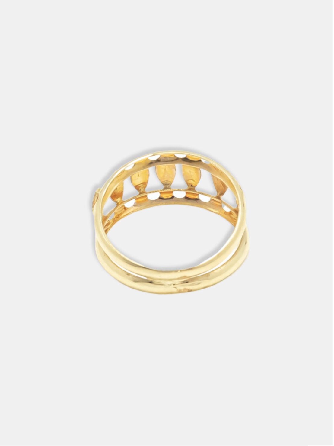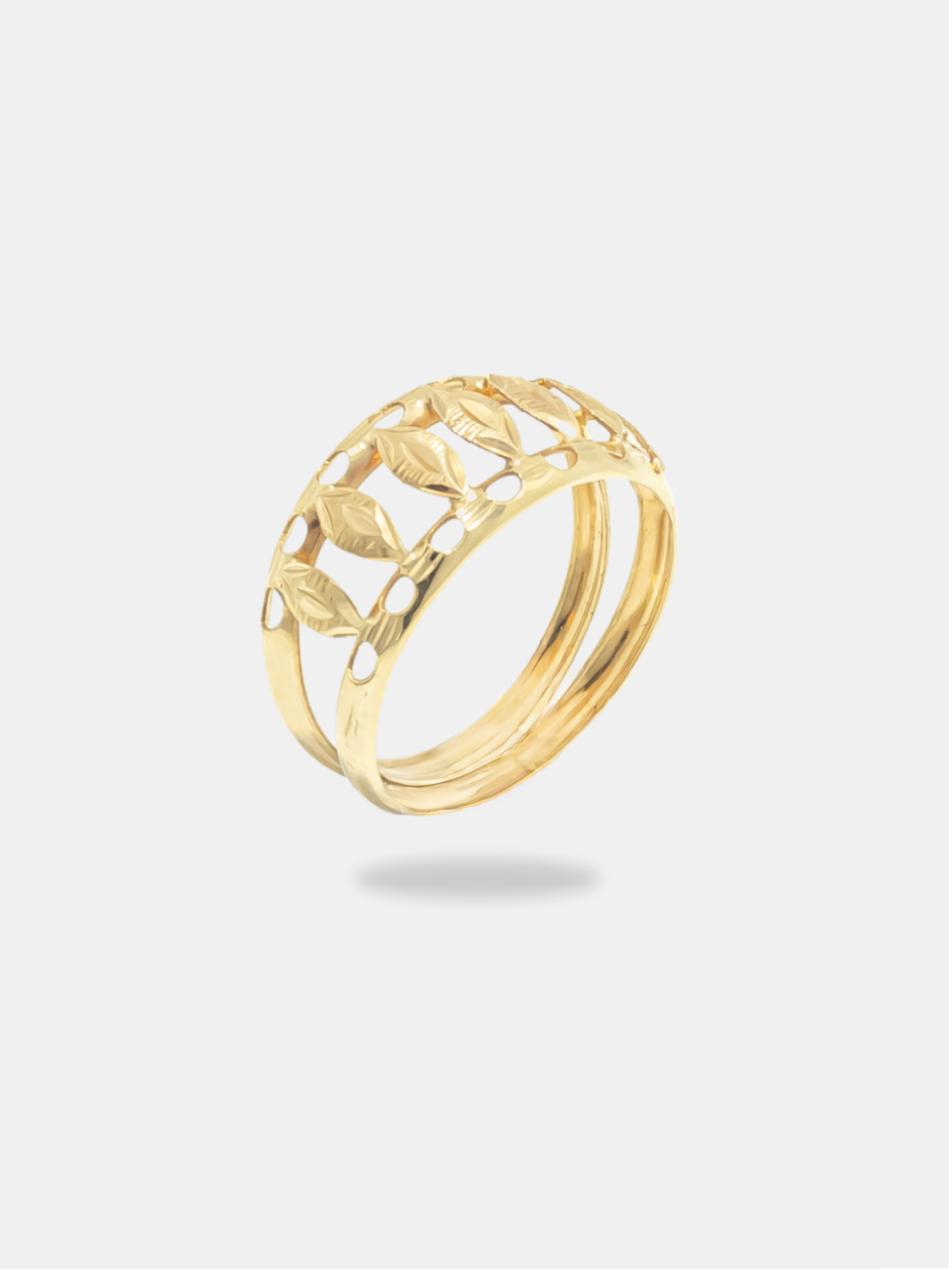 Anel em ouro 18k amarelo com aro duplo vazado, acabamento polido, fosco e esculpido, largura de 2×2 mm e design moderno que valoriza leveza visual e sofisticação.