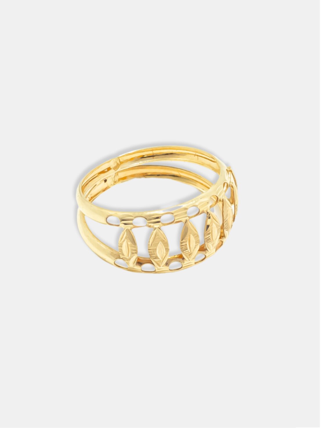 Este anel em ouro 18k possui design contemporâneo com aro duplo vazado, proporcionando profundidade visual e elegância. O acabamento polido, fosco e esculpido valoriza os detalhes da joia, criando contraste entre brilho e textura. Com largura de 2×2 mm, é uma peça marcante, ideal para quem busca um anel diferenciado e atual.
