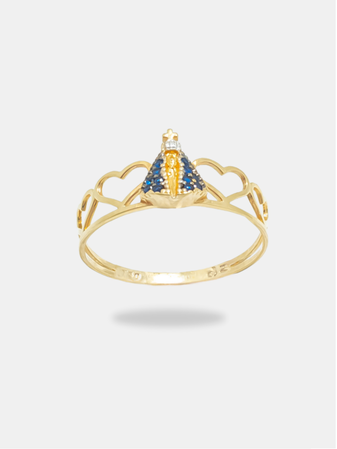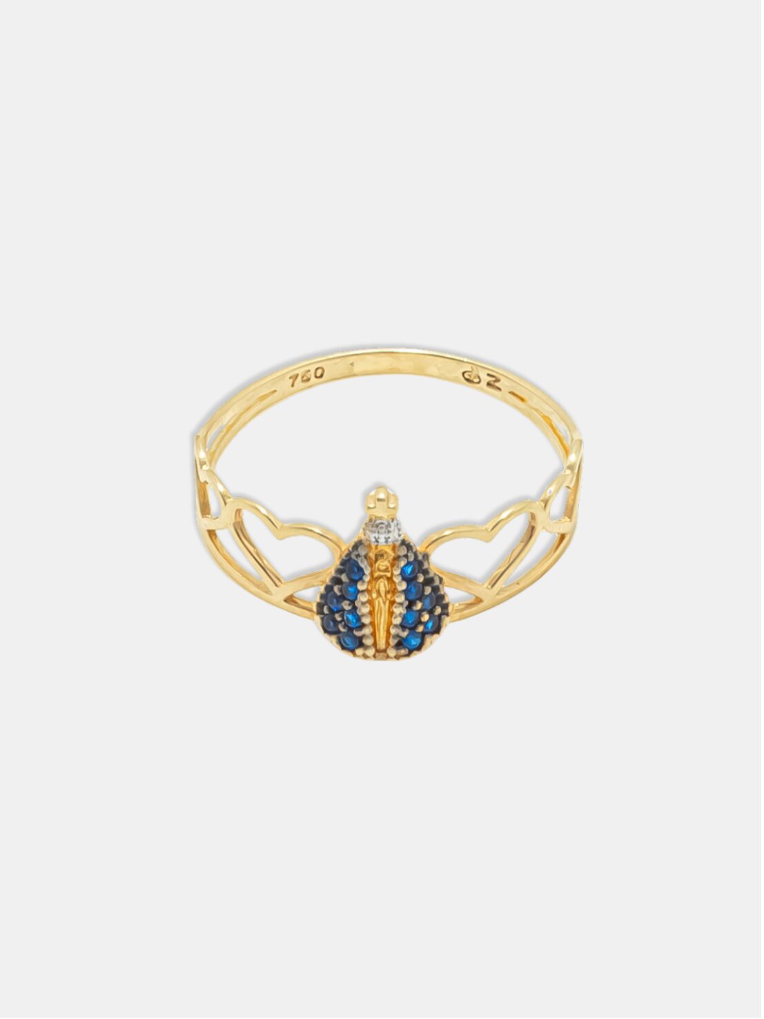 Anel confeccionado em ouro 18k, combinando ouro amarelo e branco em um design delicado e simbólico. O formato de coração vazado envolve a imagem de Nossa Senhora, transmitindo fé, proteção e devoção. O acabamento polido realça o brilho do ouro, enquanto as pedras azuis de 1 mm adicionam um toque sutil de cor e significado espiritual à peça. Ideal para quem busca uma joia religiosa discreta, elegante e cheia de propósito.