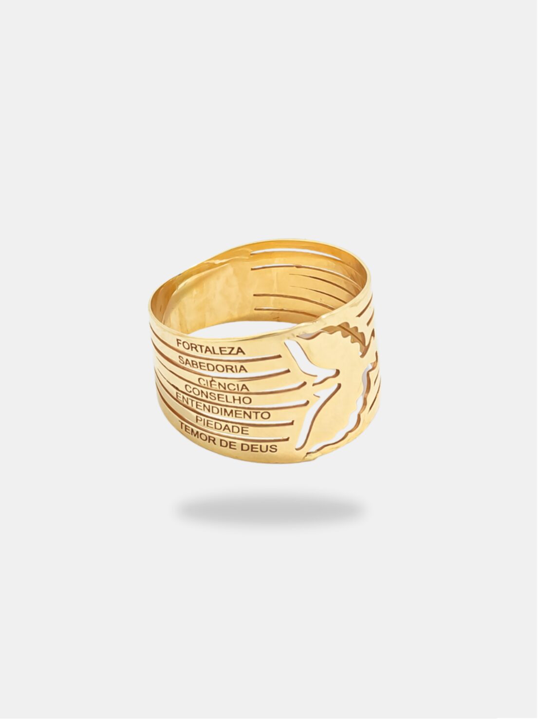 Anel em ouro 18k com símbolo dos Dons do Espírito Santo, acabamento polido e design marcante, ideal para quem expressa fé, devoção e identidade espiritual através da joia.