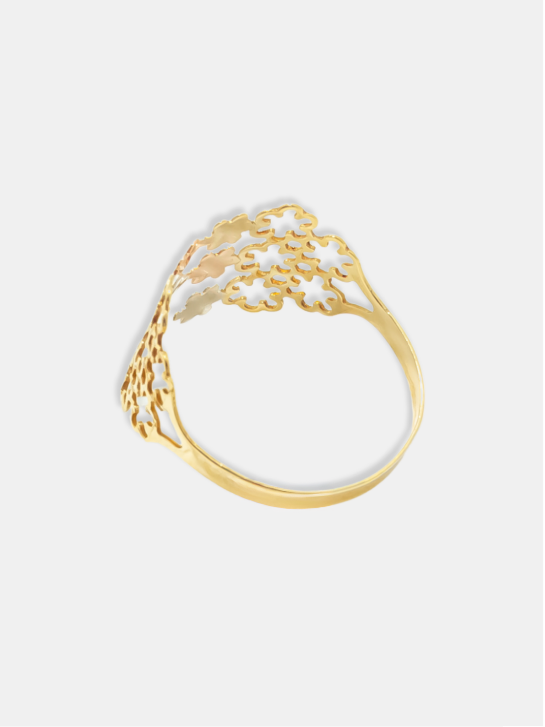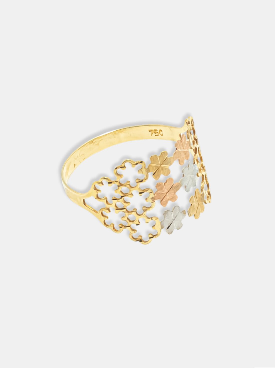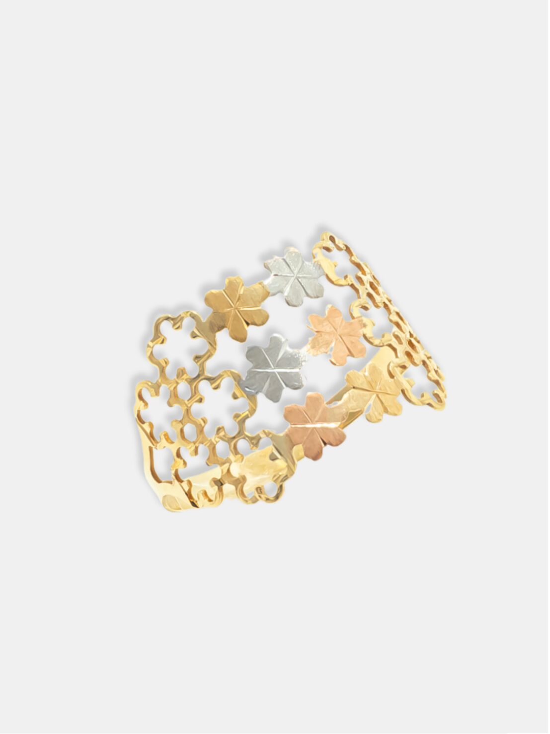 Anel em ouro 18k com flores vazadas em três cores de ouro, acabamento polido e fosco, ideal para quem busca delicadeza, sofisticação e design floral atemporal.