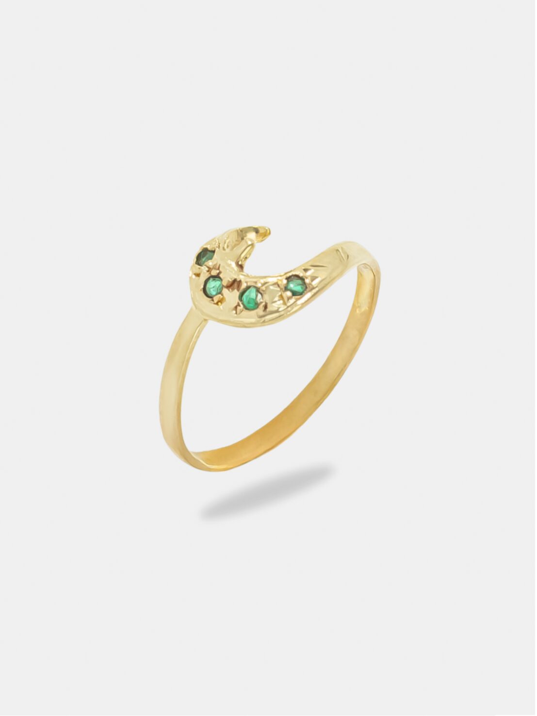 Anel em ouro 18k amarelo com design de lua e pedrarias verdes, acabamento polido e visual delicado, simbólico e feminino