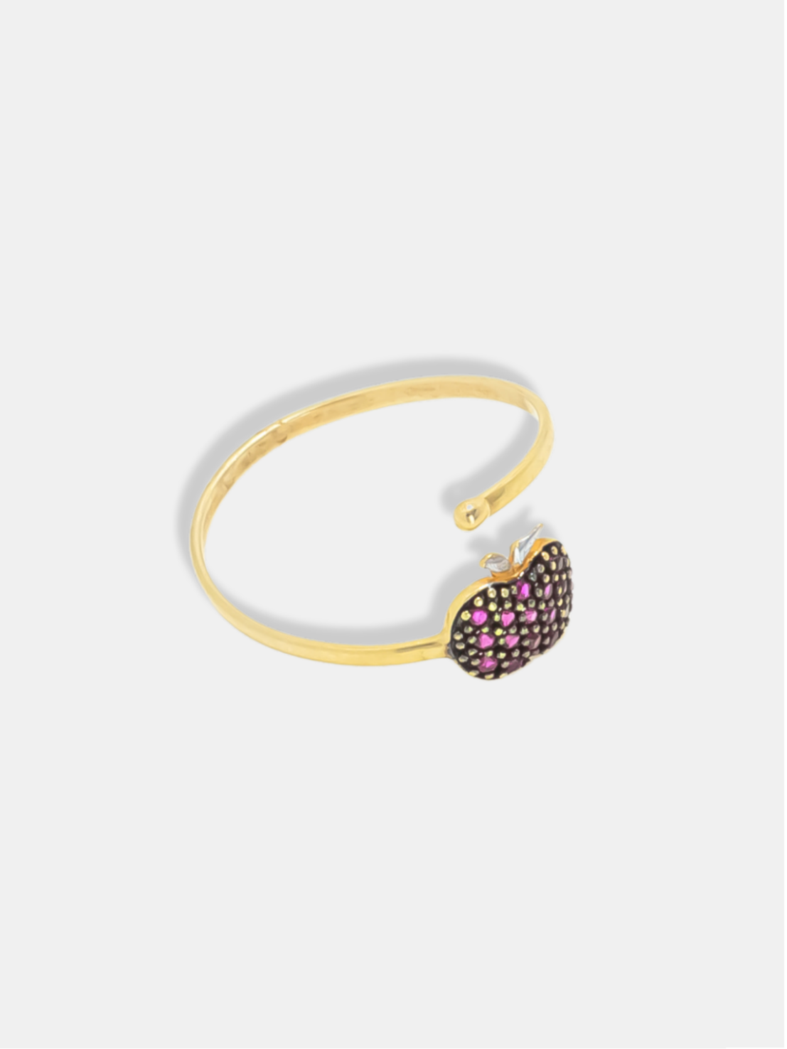 Este anel em ouro 18k foi desenhado com foco no público infantil, apresentando um formato lúdico de maçã, combinando as tonalidades amarelo e branco do metal nobre. A peça é ornamentada com 15 zircônias na cor rosa de 1mm cada, que conferem um brilho charmoso. Sua estrutura é regulável, permitindo um ajuste perfeito e confortável para a criança, unindo a praticidade do design ajustável com a sofisticação da joalheria em ouro 18k polido.