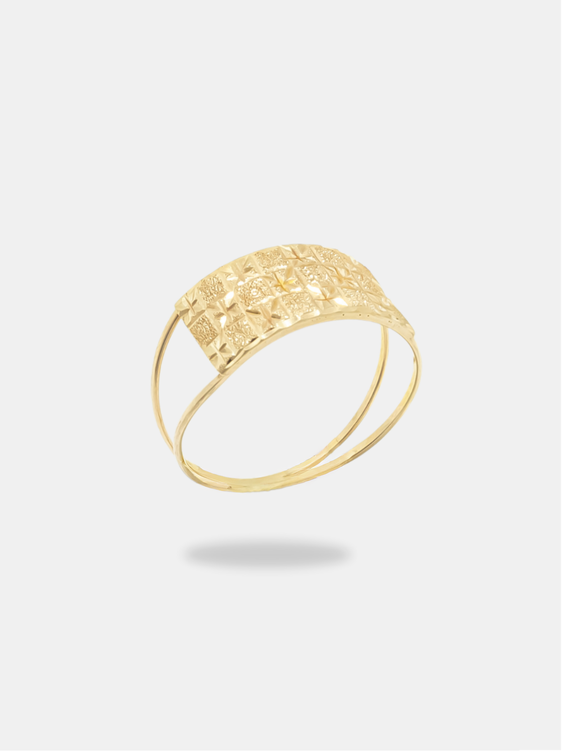 Anel confeccionado em ouro 18k amarelo, com placa frontal esculpida em design geométrico que confere personalidade e sofisticação à joia. O acabamento polido aliado ao fosco valoriza os relevos da escultura, criando profundidade visual e elegância. Uma peça de estilo contemporâneo, perfeita para quem aprecia joias com identidade forte e acabamento refinado.