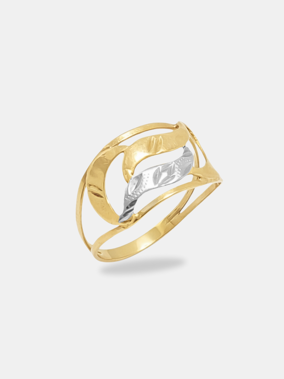 Anel confeccionado em ouro 18k, combinando ouro amarelo e branco em um design vazado que transmite leveza e sofisticação. O acabamento polido valoriza o brilho natural dos dois tons de ouro, criando contraste elegante e discreto. Com aro fino e proporções equilibradas, é uma joia versátil, ideal para uso diário ou para presentear em ocasiões especiais.