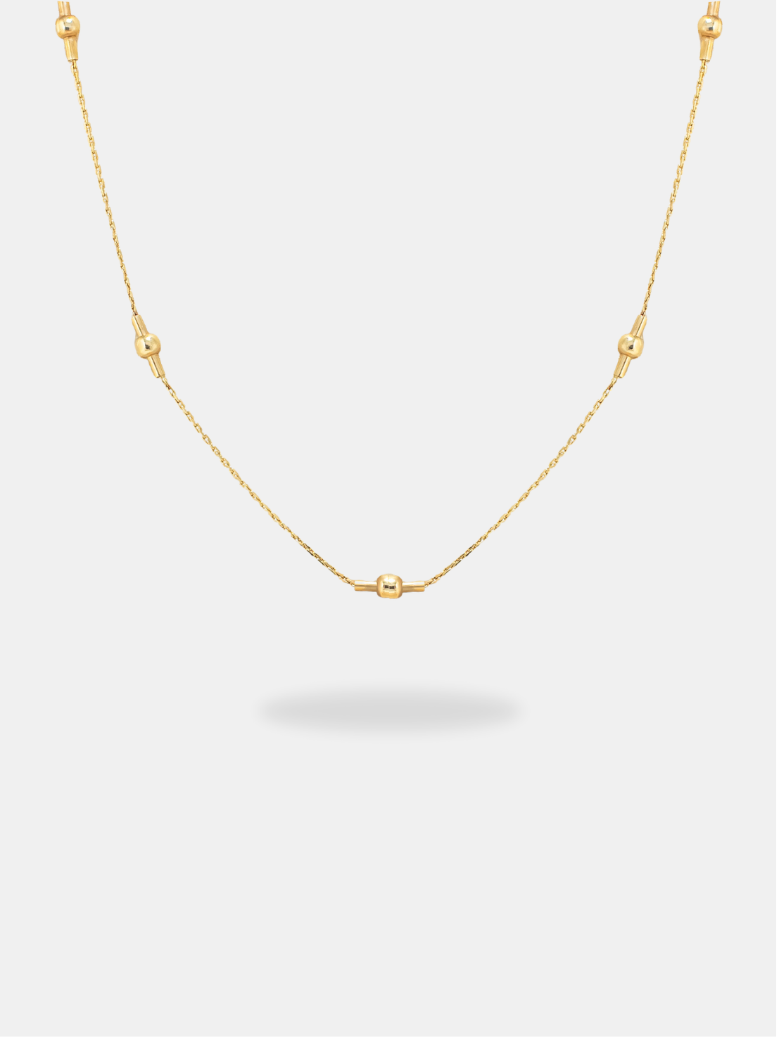 Essa corrente em ouro 18k combina o clássico elo cadeado com o charme sutil das bolinhas distribuídas ao longo da peça, criando um visual delicado, moderno e equilibrado. A presença da placa lisa amplia as possibilidades de uso, seja para personalização com gravação ou para quem prefere um design minimalista e sofisticado.
