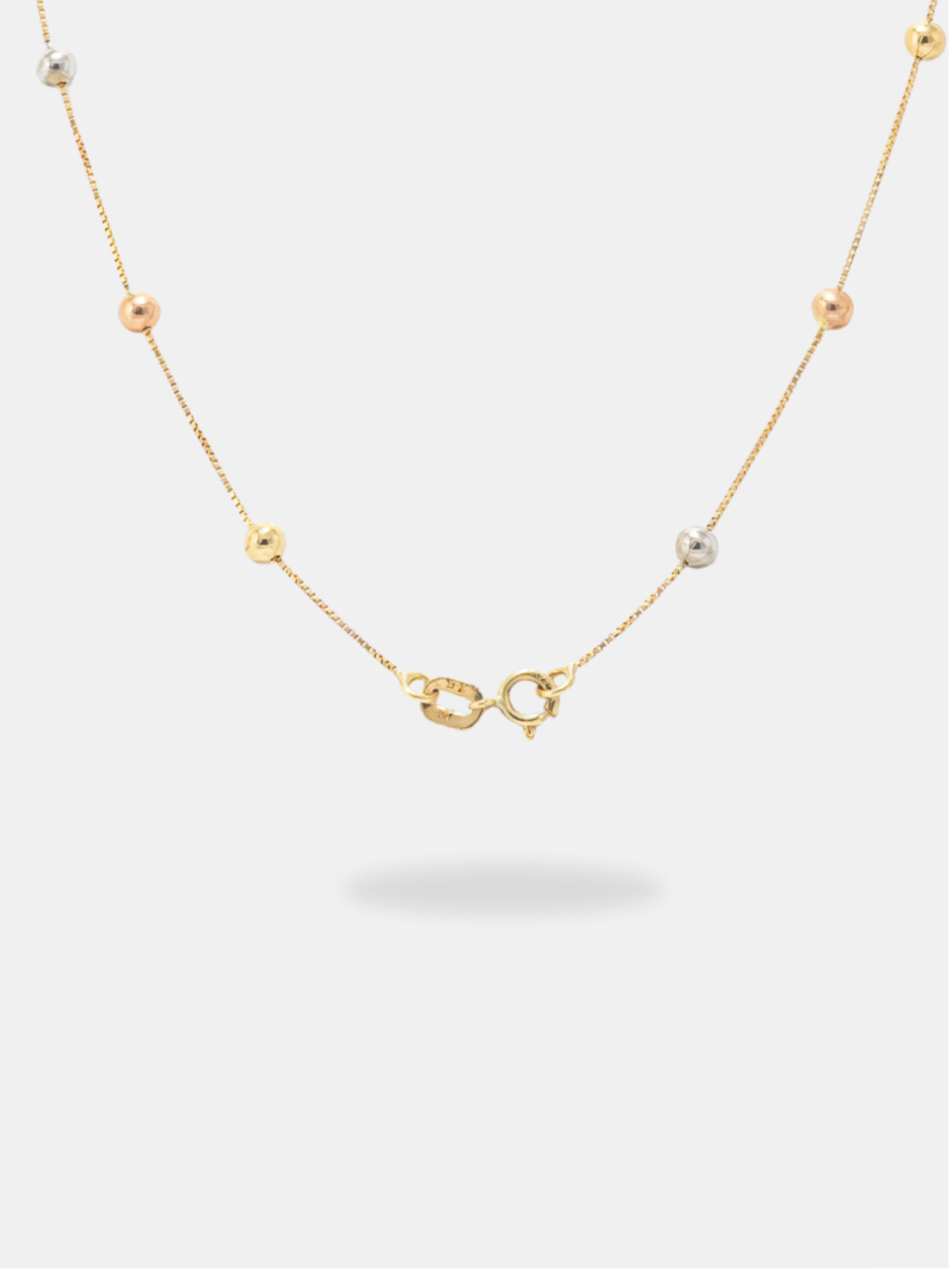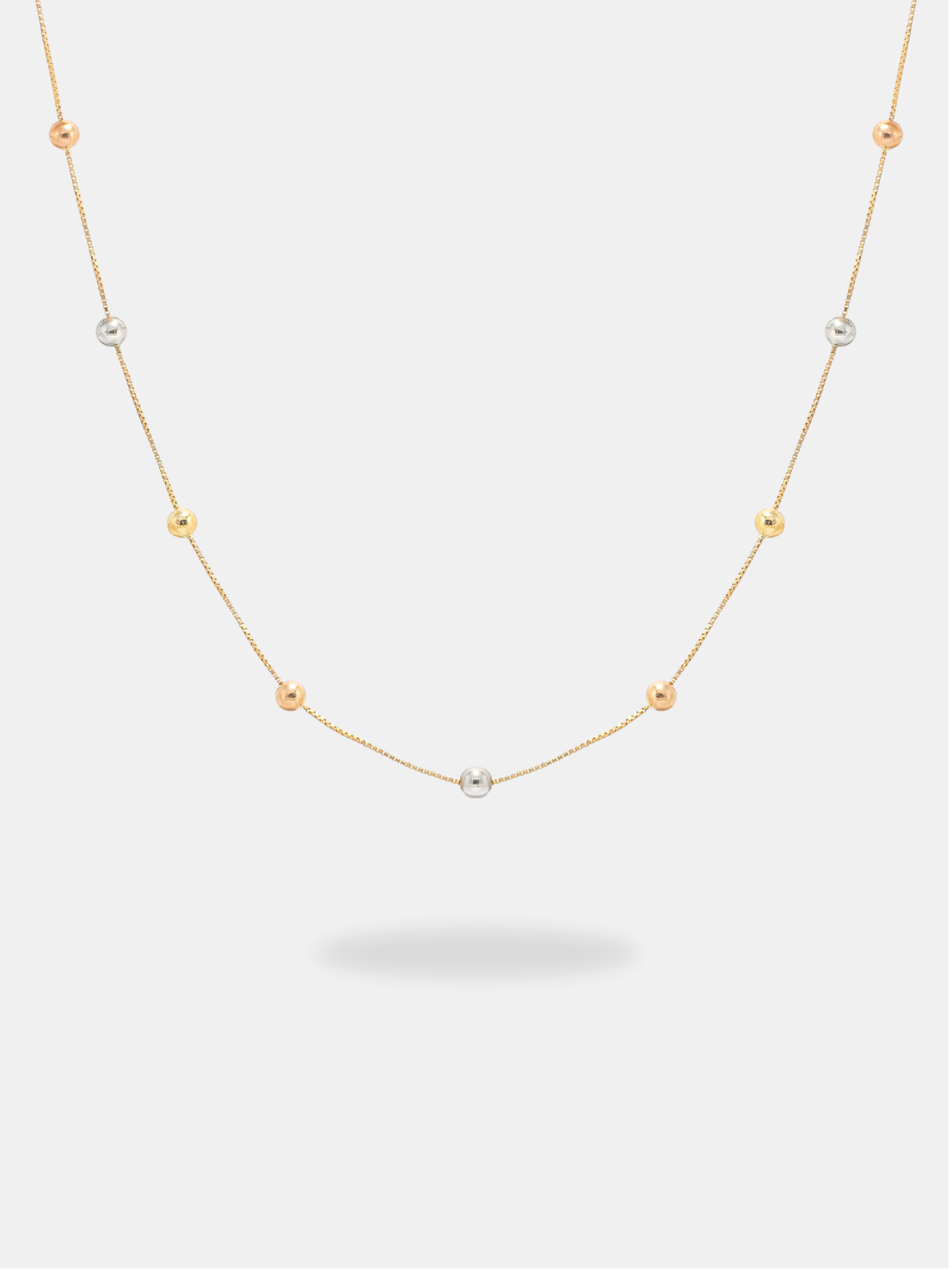 Corrente em ouro 18k modelo veneziana fina, composta por bolinhas intercaladas em três tons de ouro — amarelo, branco e rosé — criando um visual sofisticado, moderno e atemporal. O elo delicado de 0,5 mm valoriza a leveza da joia, enquanto o acabamento polido realça o brilho dos três ouros. Ideal para quem busca uma corrente elegante, versátil e feminina, perfeita para uso individual ou em composições delicadas. O fecho tipo boia garante segurança e praticidade no uso diário.