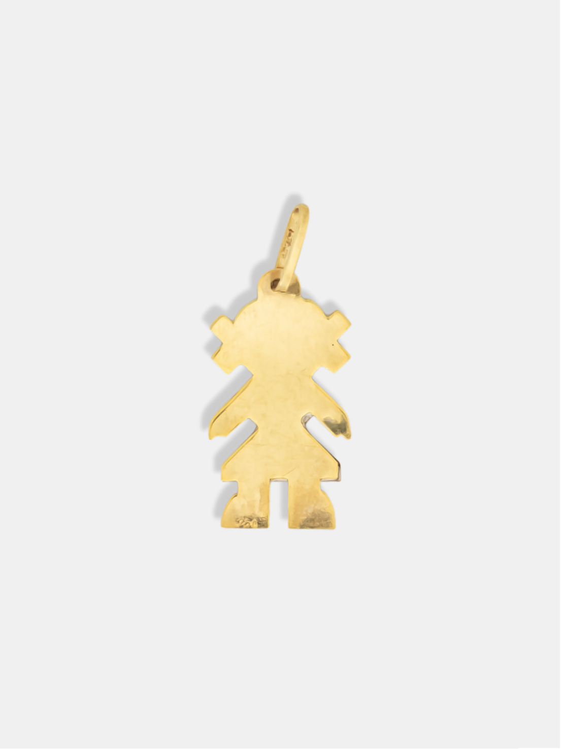 Pingente em ouro 18k modelo menina em dois ouros, combinando as cores amarelo e branco, em tamanho M. Possui medidas aproximadas de 13 × 22 mm e argola de 7 mm, com acabamento polido e esculpido que realça os detalhes e o contraste entre os tons. Uma joia delicada e simbólica, ideal para representar amor, afeto e laços familiares com elegância e sofisticação.