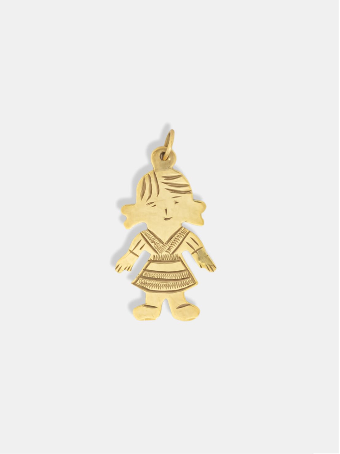 Pingente em ouro 18k no formato de menina, em tamanho M, com acabamento polido e esculpido que valoriza os detalhes da peça. Possui dimensões de 13 × 22 mm e argola com variação entre 7 mm e 4,5 mm, garantindo bom encaixe na corrente. Disponível nas combinações de cor amarelo e branco ou totalmente em amarelo, é uma joia delicada e cheia de significado, ideal para simbolizar amor, proteção e vínculo familiar.