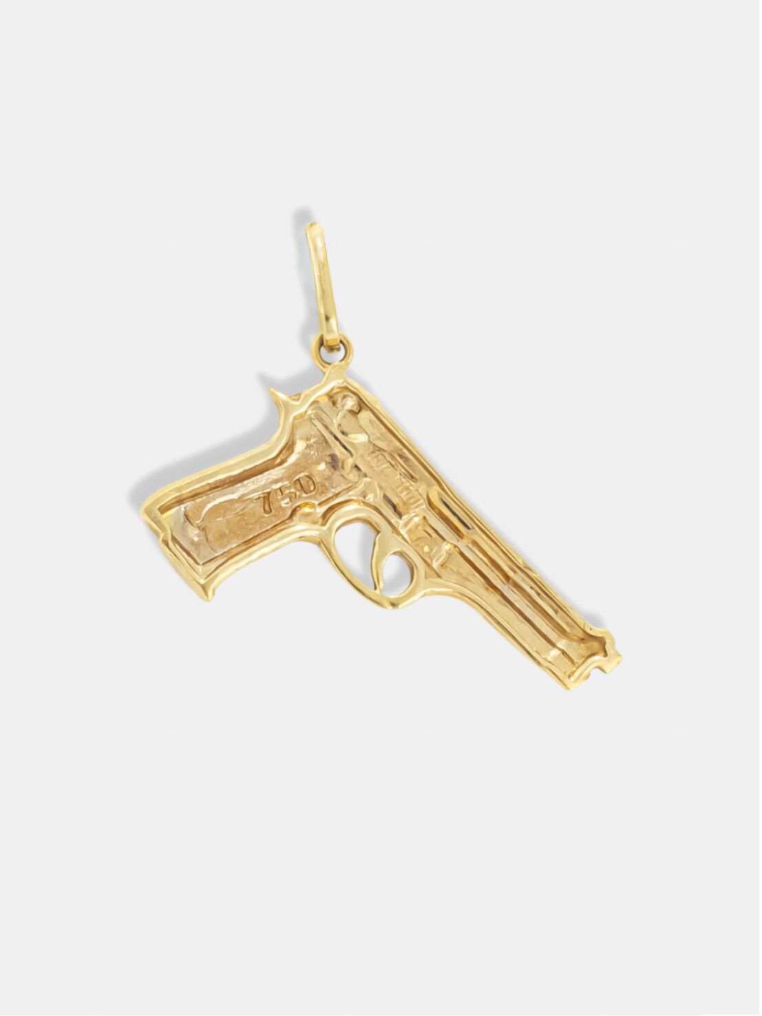 Pingente em ouro 18k modelo Revólver, com acabamento polido e cor amarelo intenso. Possui dimensões de 14 × 24 mm e argola de 7 mm, em tamanho M. Uma peça de design marcante e estilo ousado, ideal para quem busca uma joia com personalidade e presença.